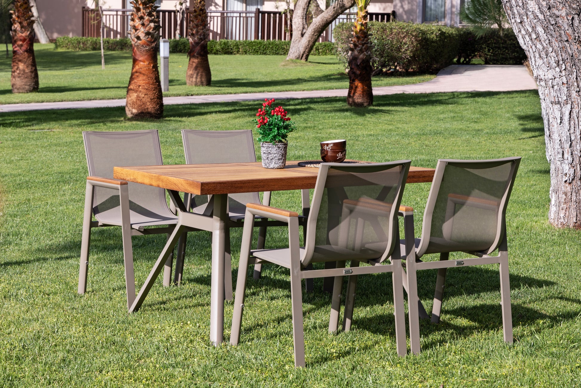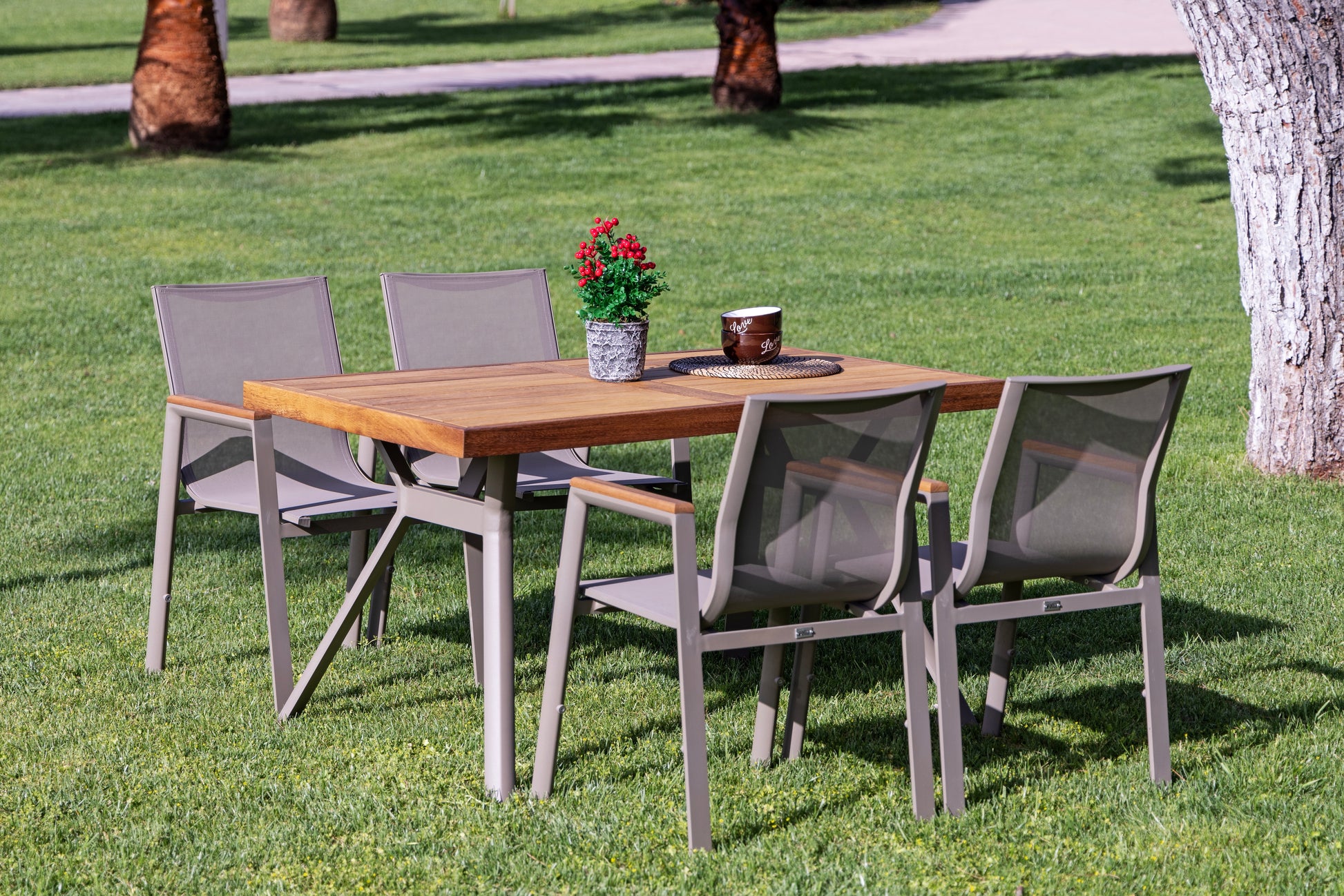 Dayanıklı gövde yapısı ve konforlu sırt destekli sandalye tasarımı, açık hava kullanımında rahat bir deneyim sağlar. Modern ve doğal malzeme birleşimi ile dış mekân dekorasyonlarına uyumlu bir yemek alanı çözümü sunar.