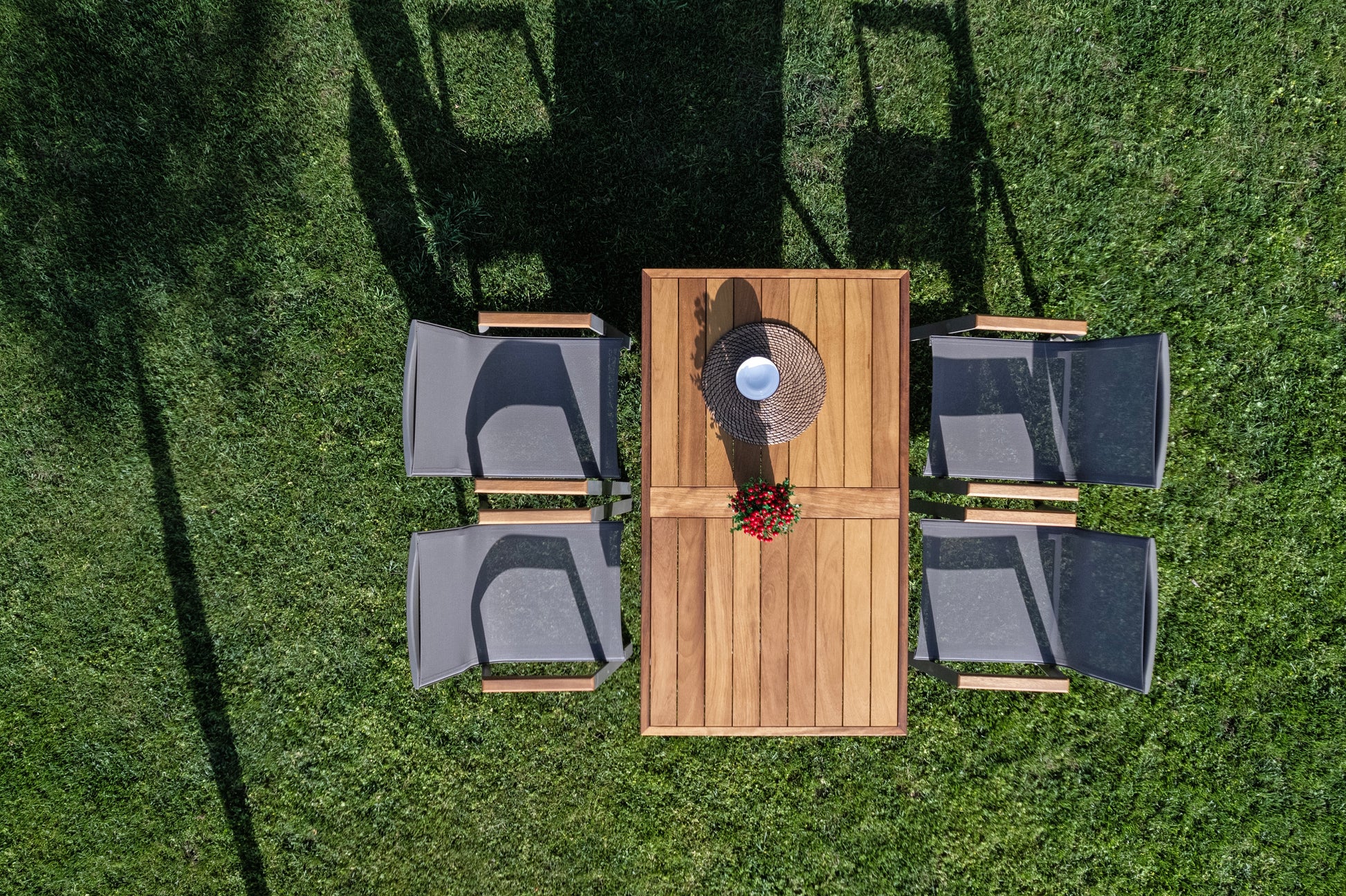 Etno masa takımı, doğal iroko ahşap yüzeyi ve modern çizgili sandalye tasarımı ile dış mekân yemek alanlarında dengeli bir şıklık sunar. Minimal formu ve sade yapısı sayesinde bahçe ve teras kullanımlarında zamansız bir görünüm oluşturur.