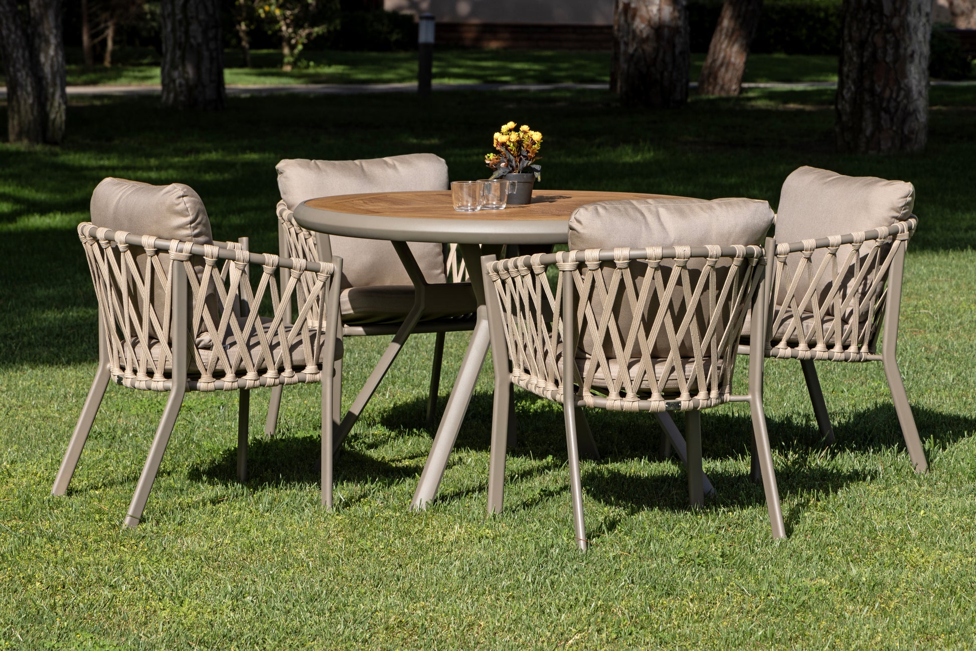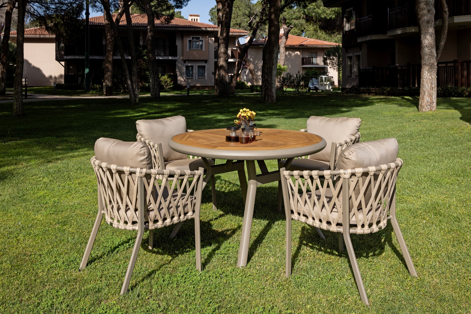 Fonte masa takımı, yuvarlak masa formu ve örgü detaylı sandalye tasarımı ile dış mekân yemek alanlarında sıcak ve dengeli bir görünüm sunar. Modern çizgiler ile doğal dokuyu bir araya getiren tasarımı, bahçe ve teras kullanımlarına uyum sağlar.