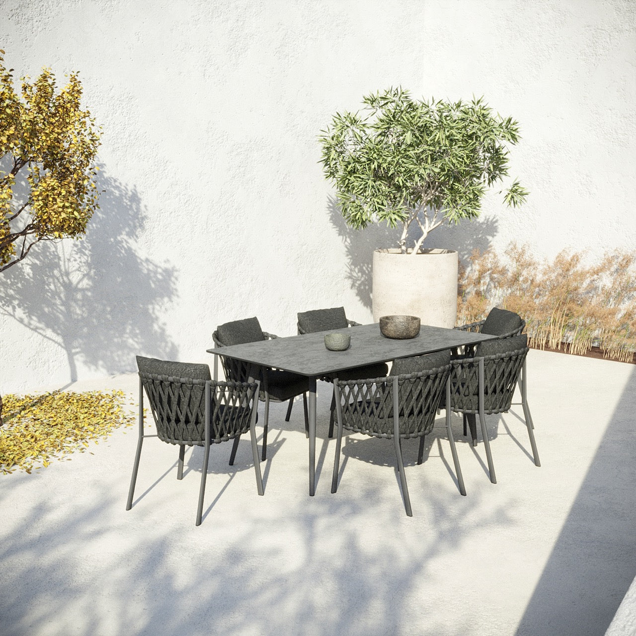 Karel Masa Takımı, güçlü oranları ve sade form diliyle dış mekânlarda dengeli ve modern bir atmosfer oluşturur. Mat yüzeyli masa tablası ve koyu tonlu sandalye yapısı, bulunduğu alana net ve sofistike bir karakter kazandırır.