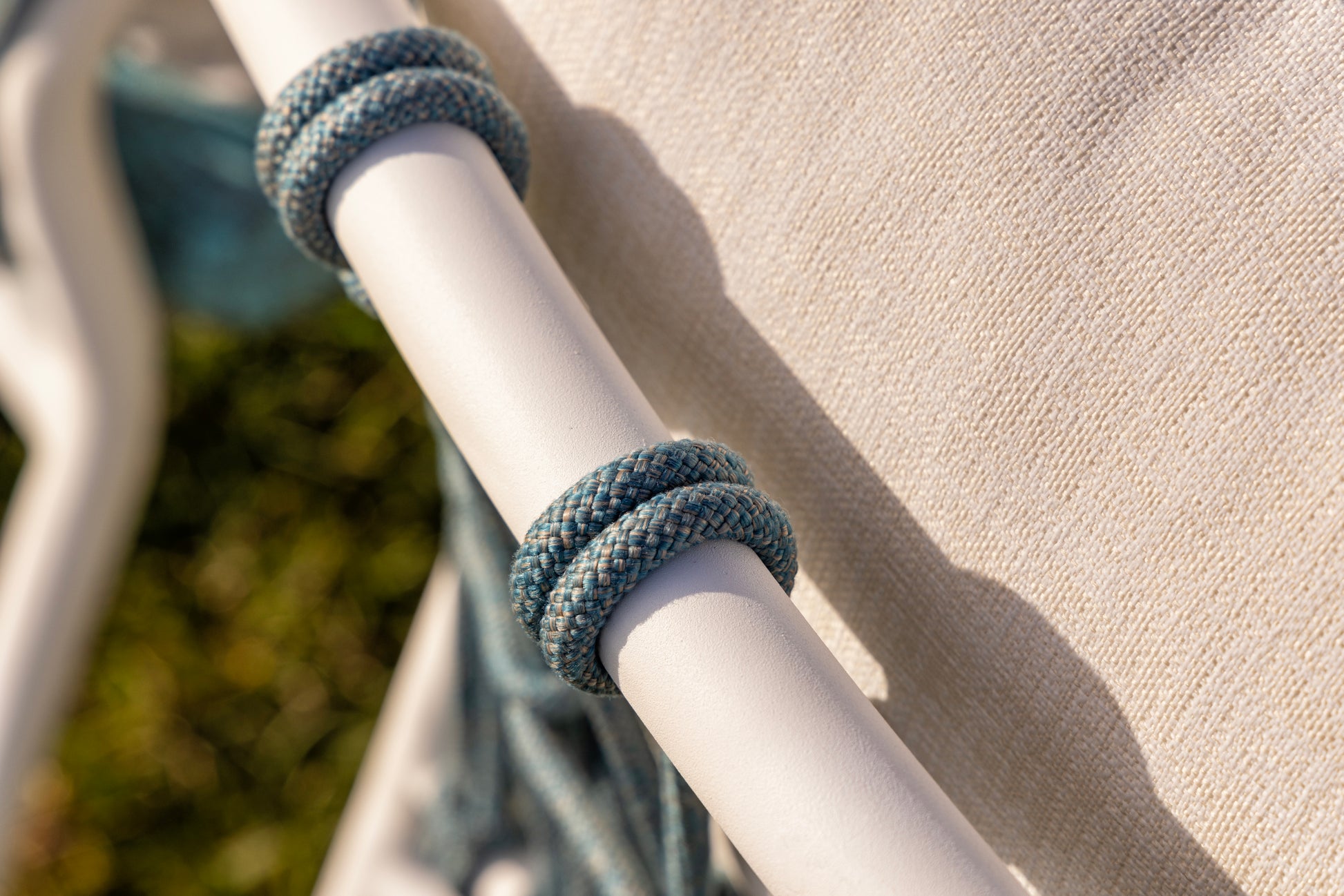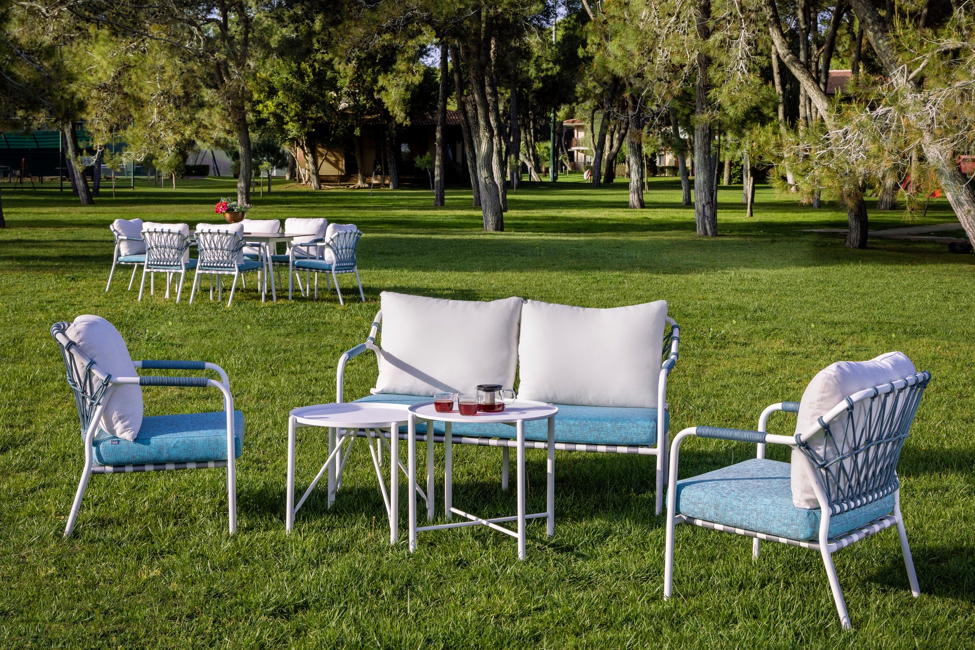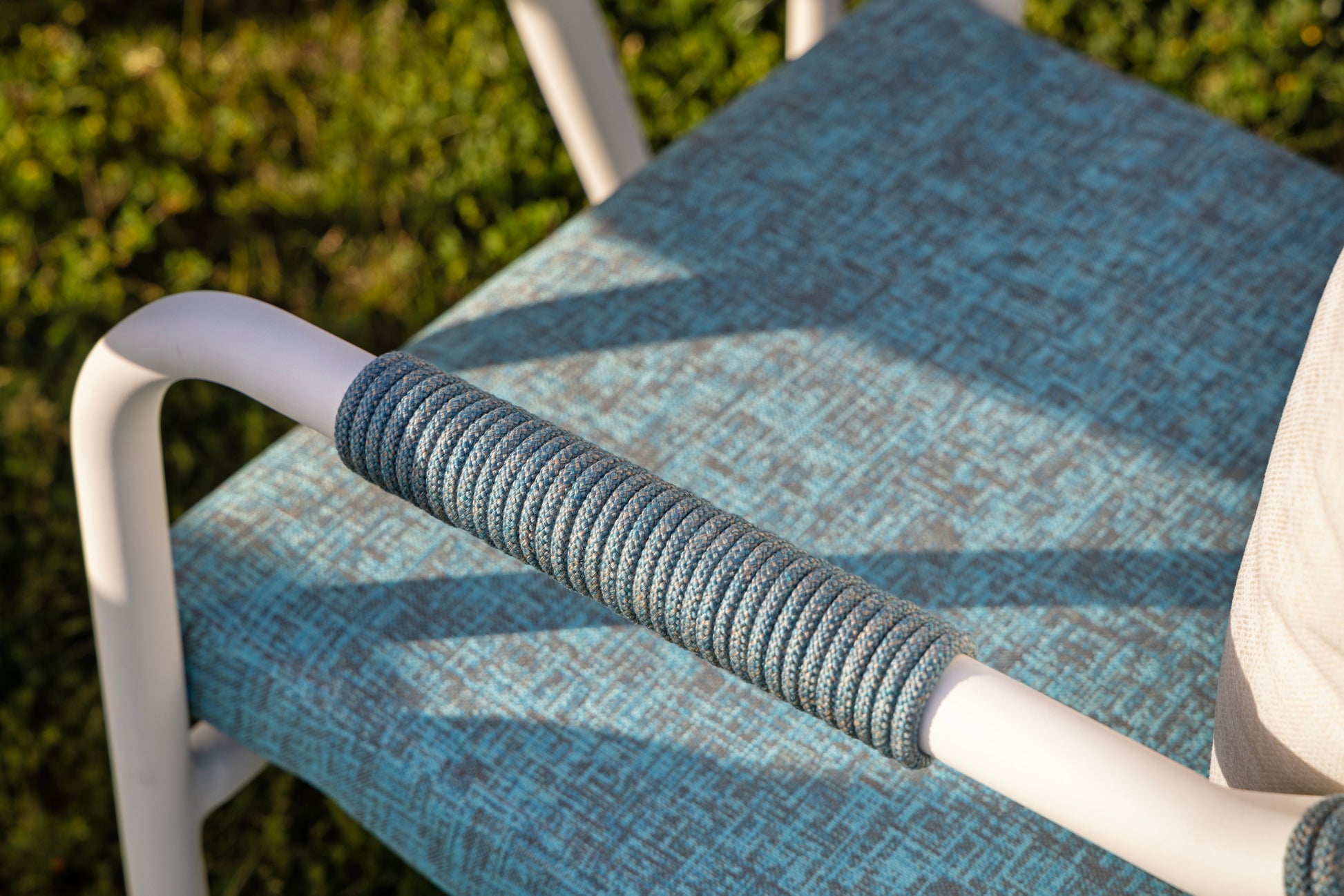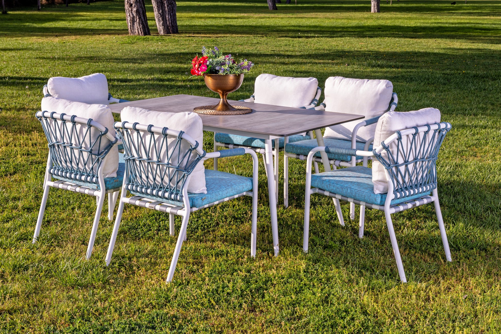 Kuaz masa takımı, zarif örgü detayları ve modern çizgileriyle dış mekân yemek alanlarına estetik bir görünüm kazandırır. Alüminyum gövde yapısı ve konforlu minderli sandalyeleri sayesinde hem şık hem de kullanışlı bir çözüm sunar.