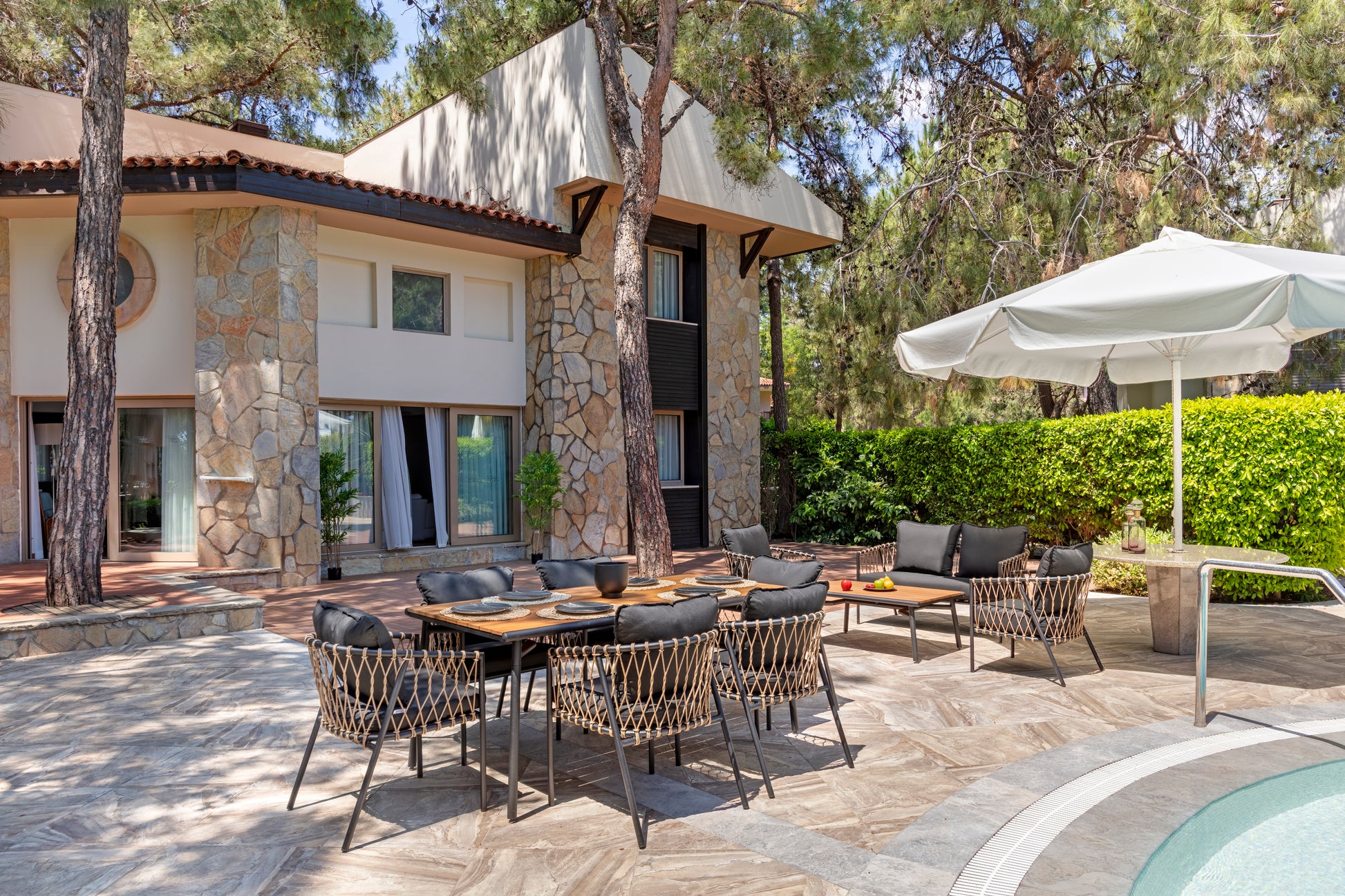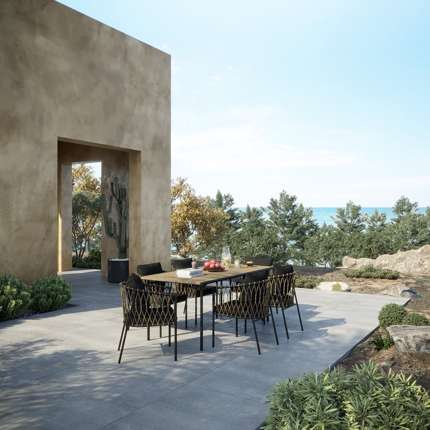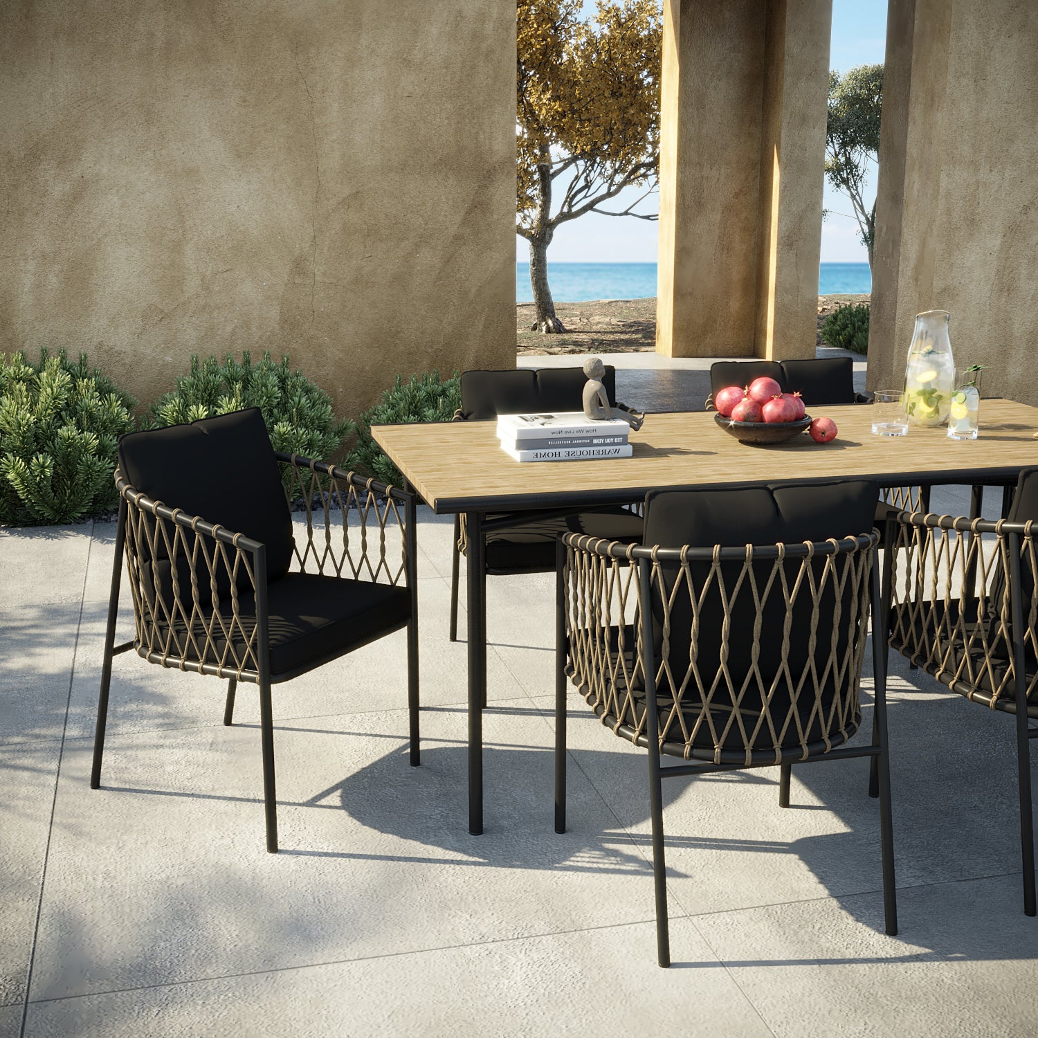 Bahçe, teras ve balkon gibi alanlarda kullanıma uygun olan tasarımı, tekli koltuk, ikili koltuk ve orta sehpa kombinasyonu ile fonksiyonel bir yerleşim oluşturur. Dış mekân koşullarına uygun yapısı ile estetik ve kullanışlı bir çözüm sunar.