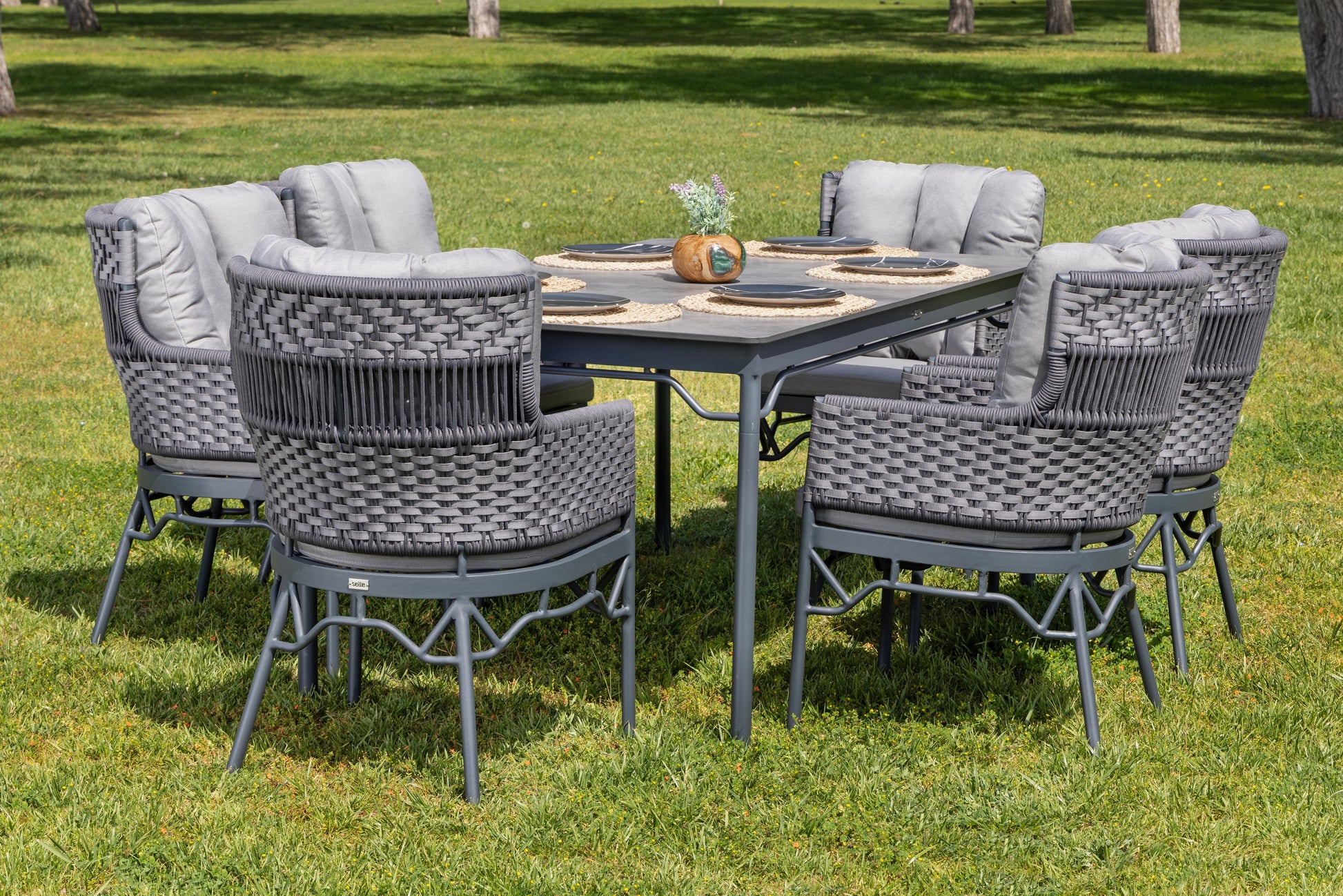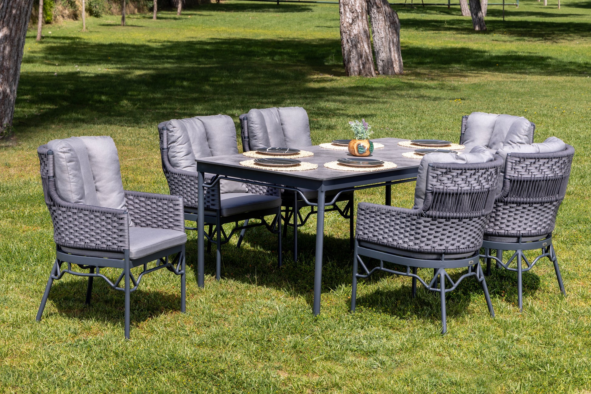 Raven masa takımı, modern çizgileri ve konfor odaklı tasarımıyla dış mekân yemek alanlarında şık bir kullanım sunar. Minderli sandalye yapısı ergonomik oturum sağlarken, geniş masa yüzeyi kalabalık sofralar için ideal bir alan oluşturur.
