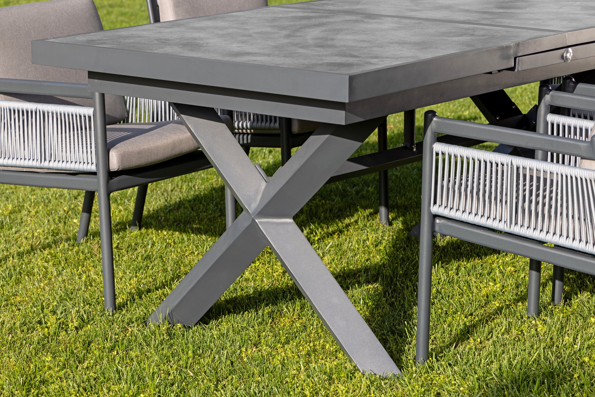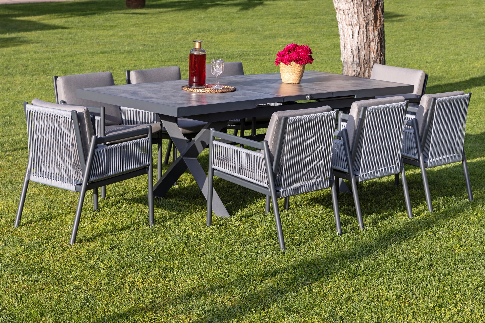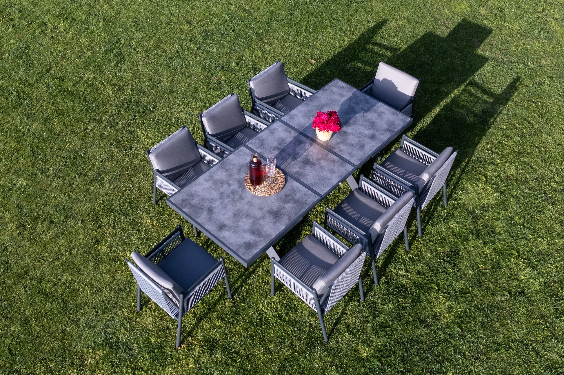 Rex masa takımı, modern çizgileri ve şık tasarımıyla dış mekânlarda estetik bir yemek alanı oluşturur. Alüminyum gövde yapısı ve örgü detaylı sandalyeleri hem dayanıklılık hem de konfor sunarken, geniş masa yüzeyi kalabalık sofralar için ideal kullanım sağlar.