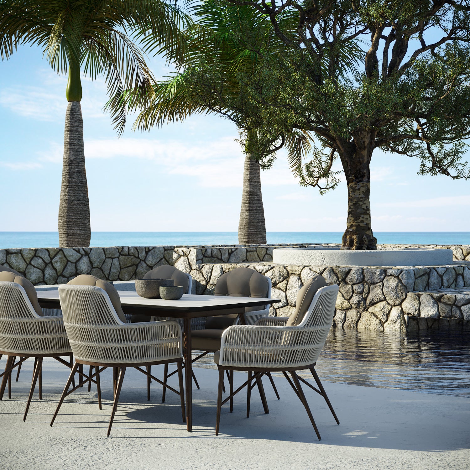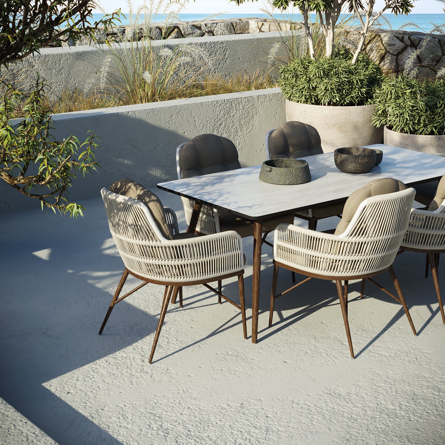 Tron masa takımı, modern ve sofistike tasarımıyla dış mekân yemek alanlarına şık bir görünüm kazandırır. Minimal çizgileri ve ergonomik sandalye yapısı konforlu bir kullanım sunarken, geniş masa yüzeyi kalabalık sofralar için ideal alan oluşturur.